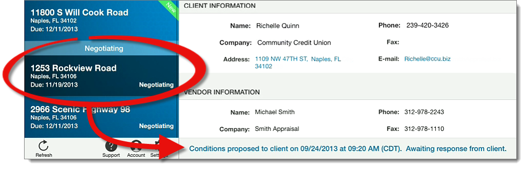 If you are negotiating the terms of an order, the order is moved to the bottom of the list of orders on the left. Tap an order being negotiated to view the proposed changes and status of the negotiation.